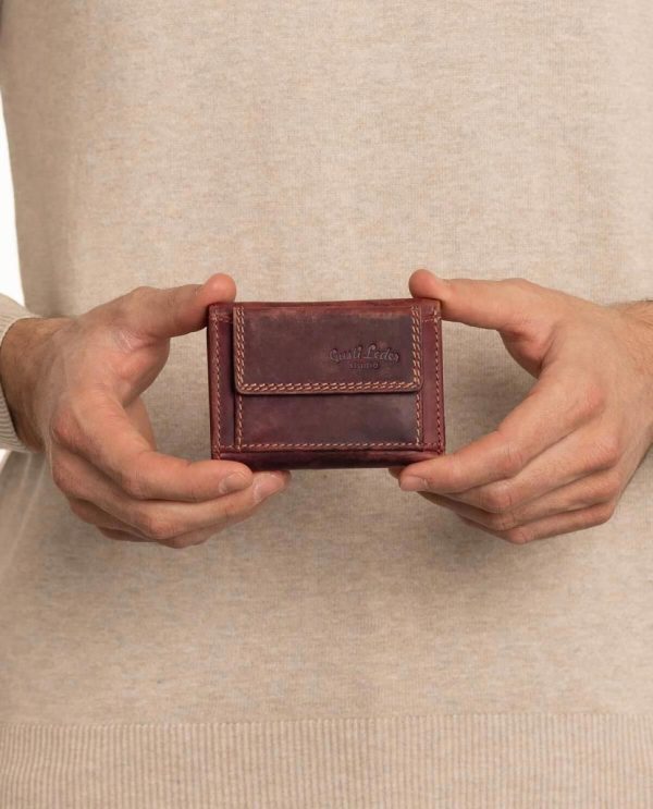 Hergestellt in :IndienProduzent:50-150 MitarbeiterLeder:RindslederLederart:Semianilinleder mit Wachs überzogenGerbung:ChromgerbungFarbe:braunAbmessungen (BxHxT):9,5 x 7,5 x 2,5 cmMarke:Gusti Leder studioVerschluss:Druckknopf